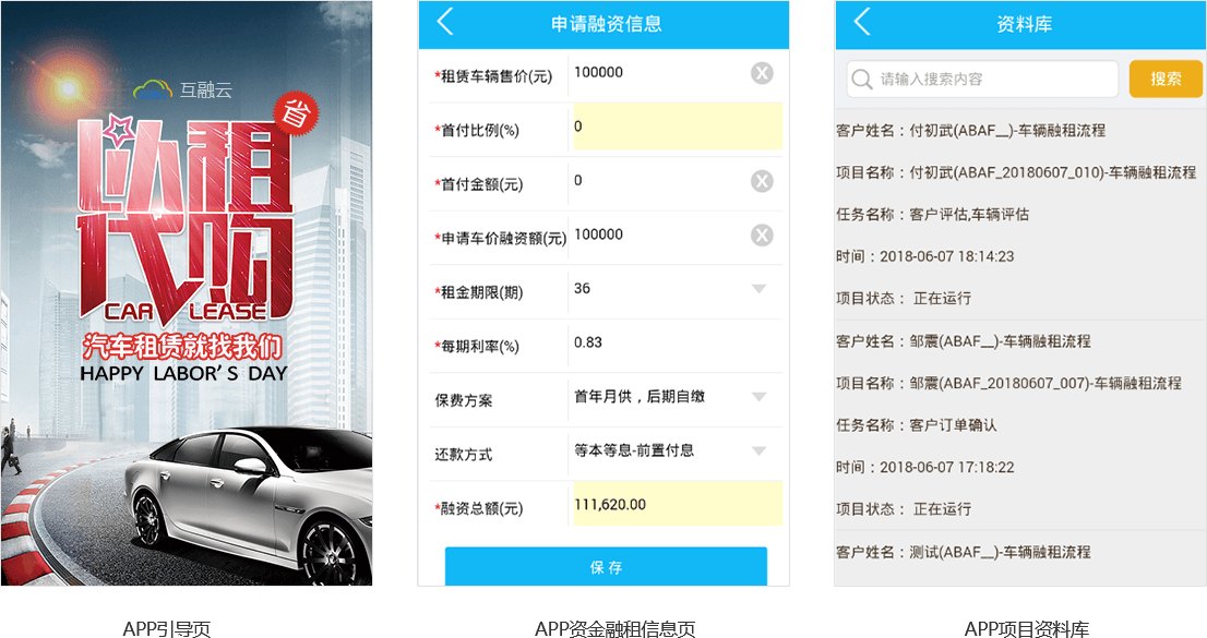 互融云整合了汽車融資租賃整個業務流程,包括租賃申請、租賃審批、租后管理、租賃車輛管理、客戶登記、合同管理、 車輛跟進記錄等全流程管理。真正實現了融資租賃公司的全自動化流程管理,強大的信息采集、風險預警、項目質控、 資產管理等功能方便了車輛融租公司更好管控業務。