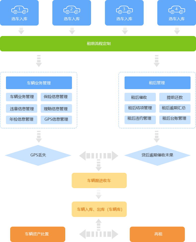 系統支持租賃車輛全流程化管理,整個車輛的融資租賃業務正常業務線、非正常業務線流程都形成閉環管理。