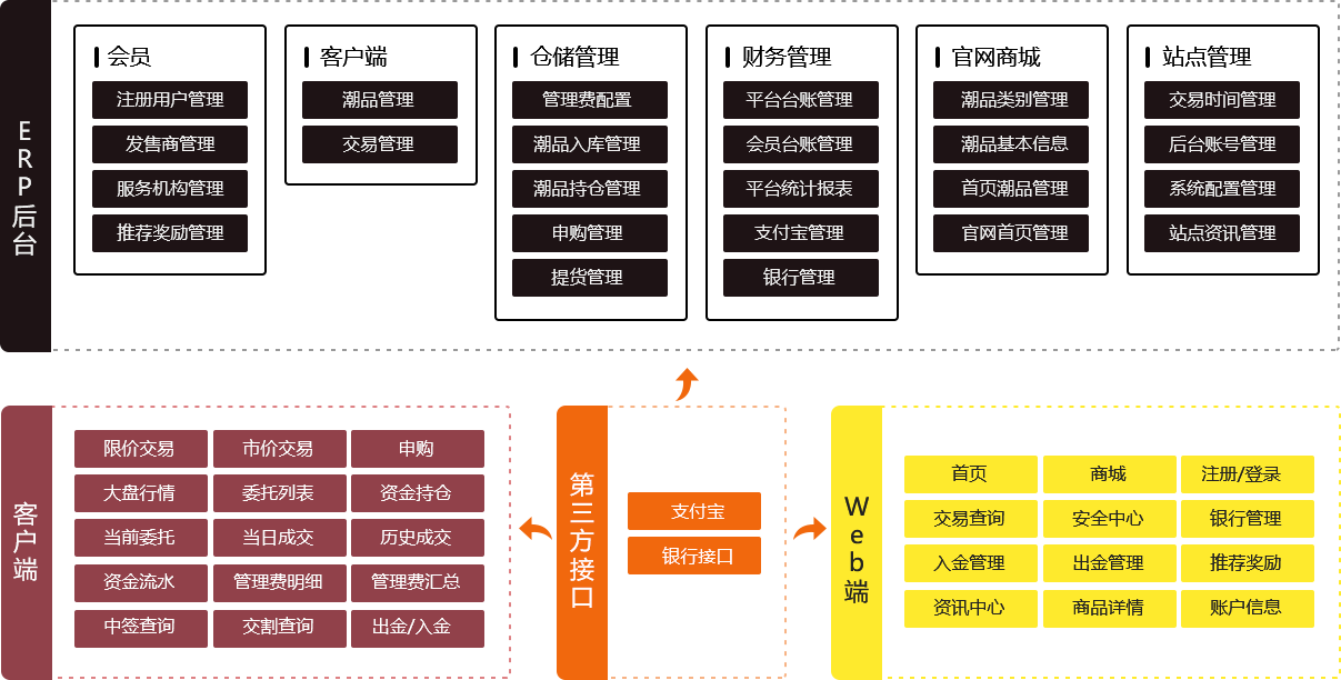 客戶端主要包含,潮品的交易,大盤行情、查看具體潮品的K線、分時圖、查詢資金持倉、交易委托單等等功能