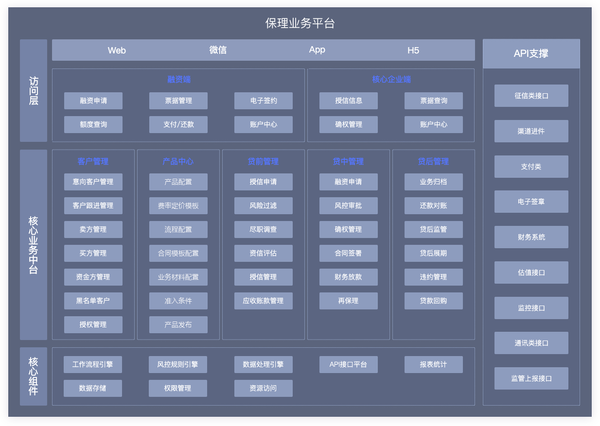 互融云深入?yún)⑴c行業(yè)16年的保理解決經(jīng)驗(yàn),是保理及供應(yīng)鏈金融系統(tǒng)軟件成品提供商,結(jié)合國內(nèi)、國際市場發(fā)展及商業(yè)保理的監(jiān)管要求及行業(yè)特點(diǎn)而開發(fā)的保理綜合管理系統(tǒng)。包括業(yè)務(wù)管理系統(tǒng)、企業(yè)端在線服務(wù)系統(tǒng)、APP應(yīng)用、門戶托管,同時(shí)可實(shí)現(xiàn)與投融資平臺、外部征信系統(tǒng)連接等一站式服務(wù),為企業(yè)解決信息化建設(shè)過程中業(yè)務(wù)開拓、產(chǎn)品推廣、風(fēng)險(xiǎn)控制、內(nèi)部管理等問題,以實(shí)現(xiàn)保理業(yè)務(wù)的全流程信息化、智能化管理。系統(tǒng)支持對供應(yīng)商,核心企業(yè)進(jìn)行多維度授信、融資申請審批、融資憑證授權(quán)確認(rèn)等,高效解決上游采購商的融資難題。系統(tǒng)涵蓋應(yīng)收賬款管理、客戶管理、資金方管理、授信管理、核心企業(yè)確權(quán)、保理池、客戶資信評級、支付結(jié)算等功能滿足全方位保理場景等全流程控制。支持移動APP、微信端、移動審批等終端,互融云提供行業(yè)高效、安全、穩(wěn)定、智能信息化綜合解決方案,并提供個(gè)性化定制服務(wù)。