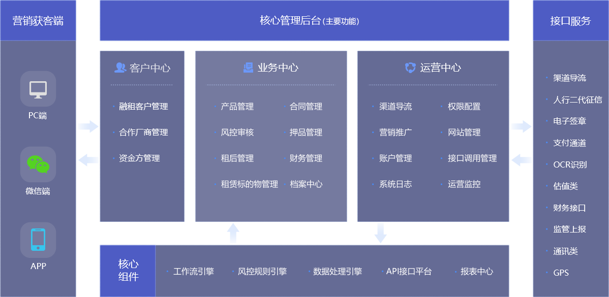 互融云融資租賃系統(tǒng)是一款高端融租業(yè)務(wù)管理系統(tǒng),集融資租賃客戶(hù)管理、立項(xiàng)申請(qǐng)、資信評(píng)估、業(yè)務(wù)運(yùn)營(yíng)、風(fēng)險(xiǎn)管理、財(cái)務(wù)核算,租后監(jiān)管等一站式業(yè)務(wù)管理模式,支持直租、回租、經(jīng)營(yíng)性租賃等業(yè)務(wù)模式的融租業(yè)務(wù)信息化管理平臺(tái)。在滿(mǎn)足基礎(chǔ)服務(wù)的基礎(chǔ)上,傾力打造規(guī)則引擎,覆蓋業(yè)務(wù)全周期全場(chǎng)景的業(yè)務(wù)開(kāi)展配套接口,全程通過(guò)可視化流程管理,智能數(shù)據(jù)決策分析、強(qiáng)大的風(fēng)控體系讓您的業(yè)務(wù)更智慧更高效。幫助企業(yè)完善業(yè)務(wù)、合理規(guī)劃管理、智能風(fēng)控、減少貸款壞賬率,降本增效。基于銀行系統(tǒng)架構(gòu)設(shè)計(jì),功能全面,多終端覆蓋,集PC+APP(android/ios)全終端產(chǎn)品于一體的系統(tǒng)服務(wù)。